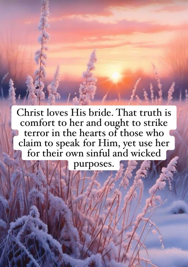 Christ loves His bride. That truth is comfort to her and ought to strike terror in the hearts of those who claim to speak for Him, yet use her for their own sinful and wicked purposes.